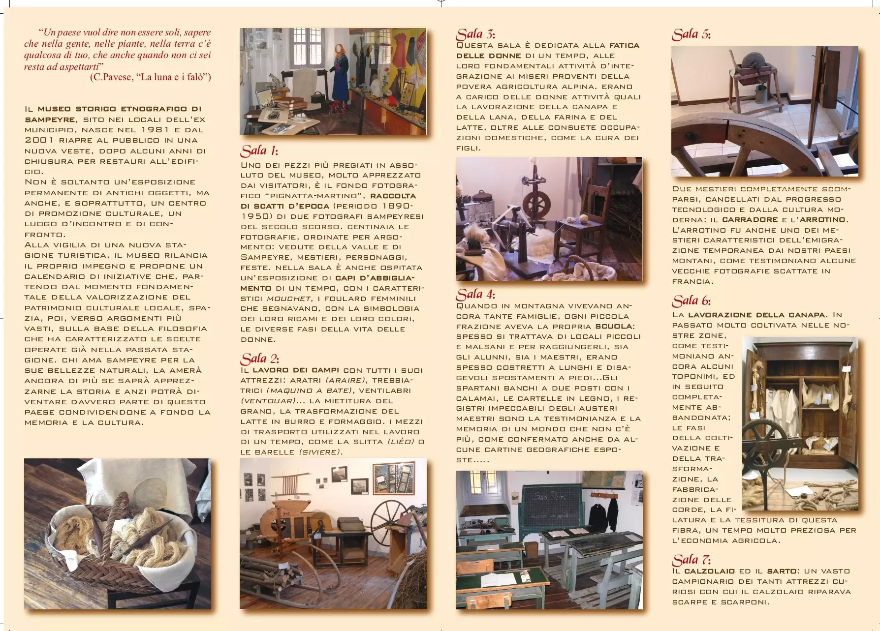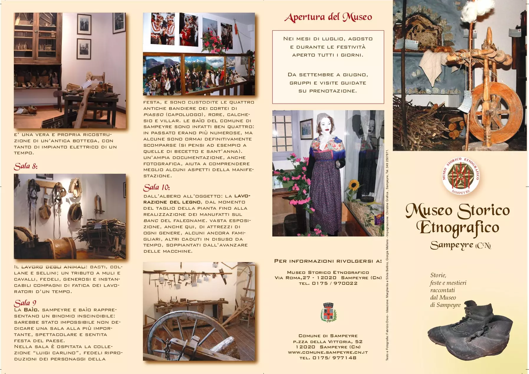 Il museo ospita, in una decina di sale, attrezzi da lavoro agricolo, per la panificazione e per la lavorazione della lana. Vi sono inoltre diversi laboratori di mestieri (maniscalco, falegname, fabbro), nonché costumi tradizionali e fotografie d'epoca. Fa parte del museo anche una collezione di modelli con i personaggi della Baìo e gli autentici drappi delle quattro Baìo di Sampeyre. Durante l'estate al museo si organizzano serate, stages, incontri. Infatti il museo non è soltanto un'esposizione permanente di antichi oggetti, ma anche un centro di promozione culturale, un luogo d'incontro sia per i turisti sia per i residenti, con un calendario di iniziative che, partendo dalla valorizzazione del patrimonio culturale locale, spazia, poi, verso argomenti più vasti.